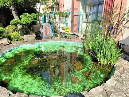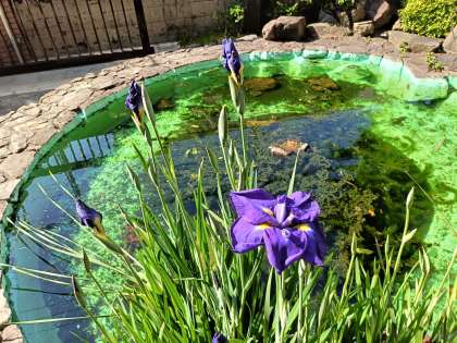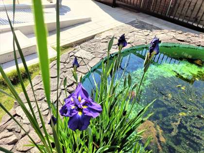 玄関横のメダカ池に、花菖蒲が紫色の花を咲かしています。