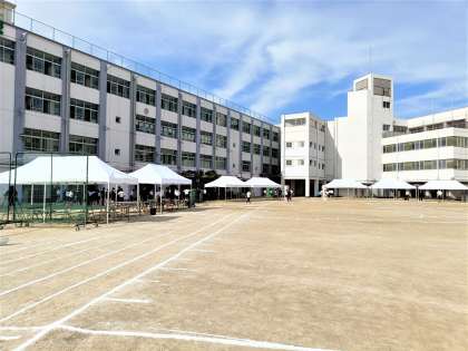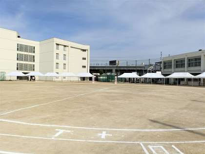 朝早くから、係生徒がテント設営をしてくれて体育大会の準備が完了しました。