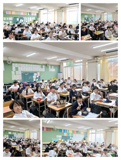 今日は、体育大会の予備日であったため給食の提供がありませんでした。どのクラスもお弁当を机上に広げての昼食となりました。写真は、1年生の様子です。