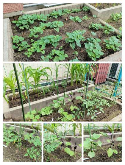 玄関右奥の菜園では、チャレンジ学級の生徒が定期的に水やりをしてくれています。とうもろこし・なす・きゅうり・落花生・さつまいも・ミニトマトなどを育てています。なす・きゅうり・ミニトマトは実がなりつつあります。