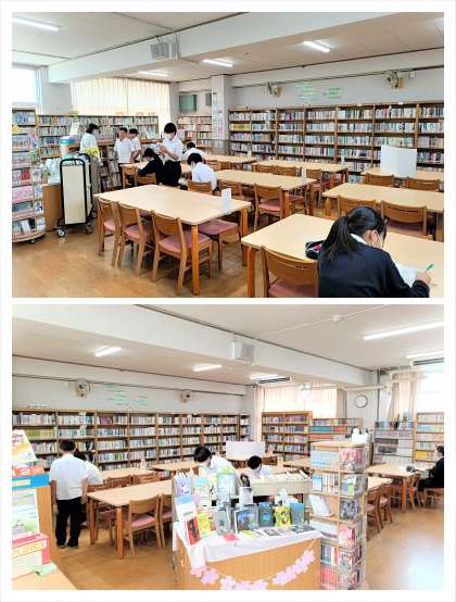 昼休みの図書室開放の様子です。勉強している人がいたり、本やマンガを読んでいる人もいます。ぜひ図書室に足を運んでください。