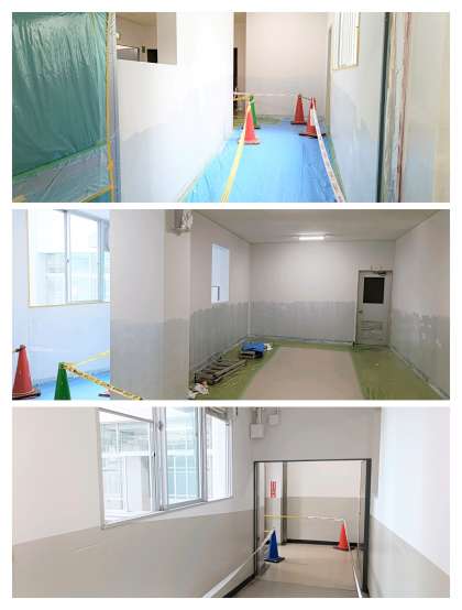 新館と旧館の渡り廊下部分の塗装が、剥がれてきていたため、近隣小学校の管理作業員さんと一緒に壁の補修やペンキの塗り直しを行っています。3階はほぼ補修が終わりました。