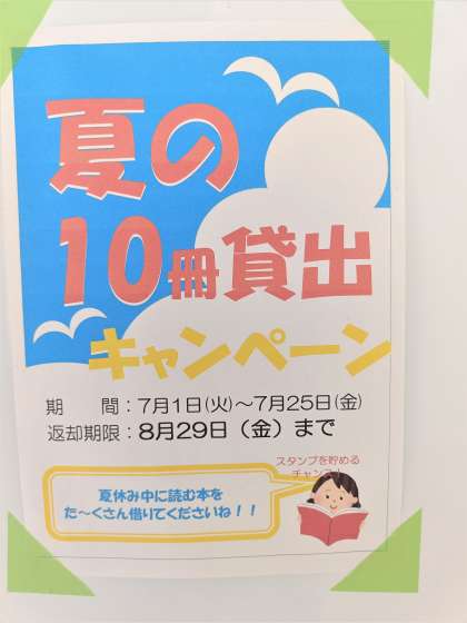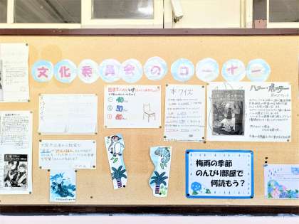 図書室前の掲示板には、文化委員が作成したおすすめ本の紹介やクイズなどが掲示されています。また、夏休み中の本の貸し出しも始まっています。ぜひ図書室に足を運んでくださいね。