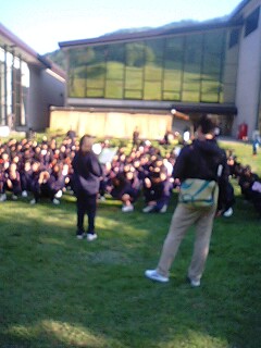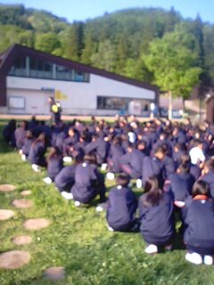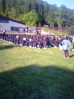 朝の集い。今日は朝食を食べた後、午前、午後に分かれてラフティングをします。