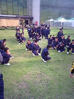 朝の集い。男子の集合が早い。前の晩、しっかり寝たようです。
