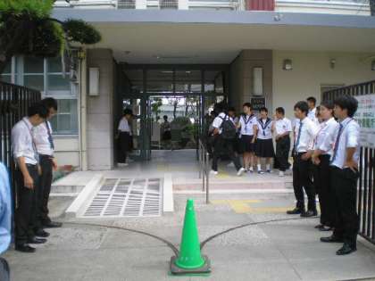 風紀委員の生徒たちが正門玄関で大きな声であいさつしています。