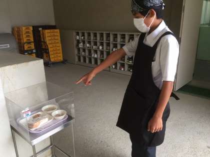 盛り付けの見本をしっかり確認して当番を頑張っているようですね。