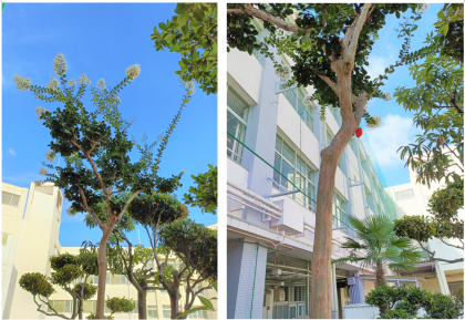 玄関には、「百日紅(サルスベリ)」の白い花が咲いています。名前の通り、初夏から秋までの長い間、鮮やかな赤色やピンク、白の花を咲かせます。幹が猿でも滑るほどツルツルしていることから「サルスベリ」の名前が付けられました。