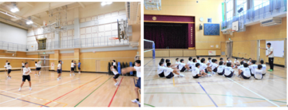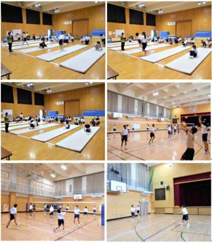 1年生の体育は、男子はバレーボール、女子はマット運動になりました。バレーボールでは、オーバーハンドパスやアンダーハンドパスを二人組で行っていました。マット運動では、前転や後転の練習をしていました。
