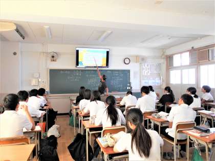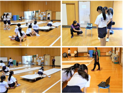 授業の様子です。3年生数学では、変化の割合を求める方法について学習しました。1年生女子体育では、前の時間に学習した前転や後転についてポイントを確認し、練習したのち本日の課題である開脚前転の練習を行いました。マットの下にロイター板を置いて、坂道を転げ落ちるように少し勢いをつけて前転していました。練習後は、各々で自分の動きをパソコンで確認していました。