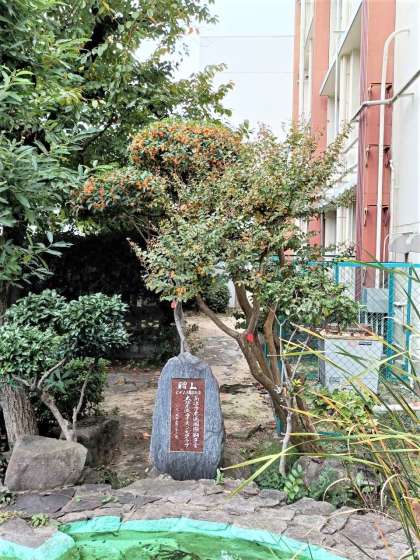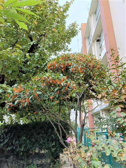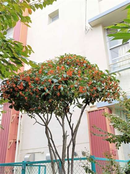 街中でも金木犀(きんもくせい)の香りがすることがあります。瑞光中学校の玄関にも金木犀の花が咲き、いい香りが漂っています。