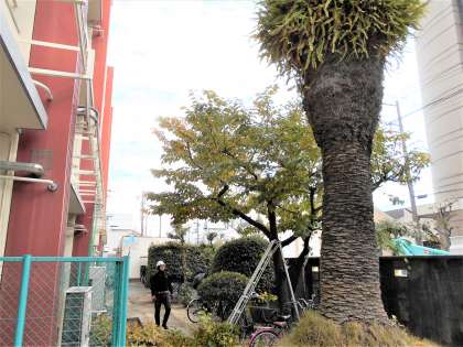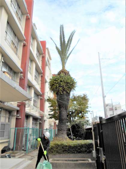 業者の方が、玄関周辺の桜やフェニックスの剪定を行っています。うっそうと茂っていたフェニックスもすっきりしました。