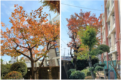 正門横の桜の樹の葉も黄緑か黄、黄から茶と段々と色付いてきました。