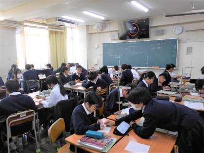 1年生の理科の授業の様子です。バネに重りをかけて、バネの伸びを計測しています。