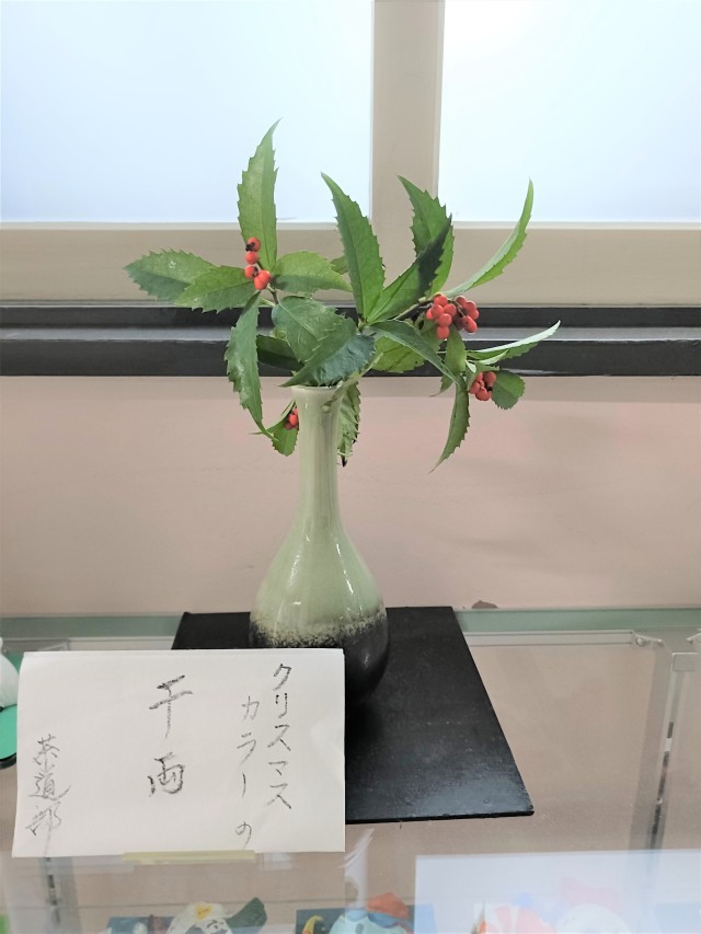 茶道の先生が、いつもお花を届けてくれます。クリスマスにふさわしい「センリョウ」の花です。