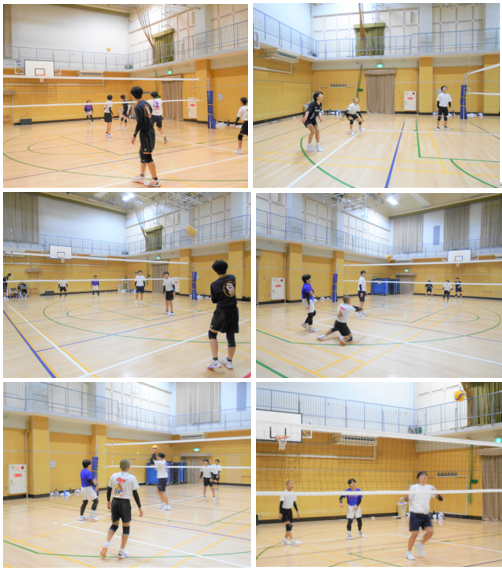 男子バレーボール部の練習の様子です。1年生と2年生に分かれて、相手コートの人のいない場所にボールを落とす練習をしています。
