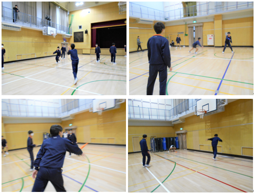 3年生男子は、アルティメットの授業が始まっています。アルティメットは、フライングディスク(フリスビー)をパスでつなぎ、相手のエンドゾーン(ゴールエリア)でキャッチして得点する、7人制の団体競技です。授業では、安全性のあるやわらかいディスクを使用しています。写真では、飛んでいるディスクがわかりにくいですが、目を凝らして探してみてください。