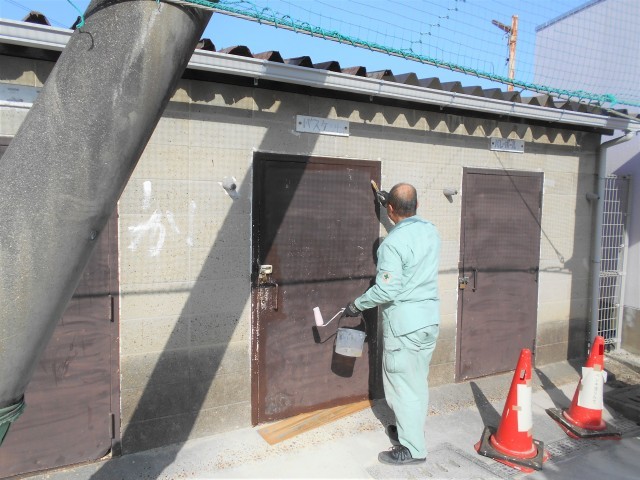 管理作業員さんが、部室の鉄扉をきれいに塗りなおしてくれています。