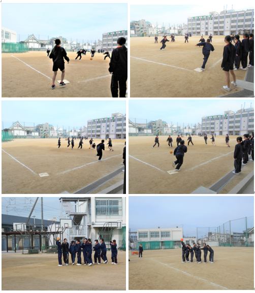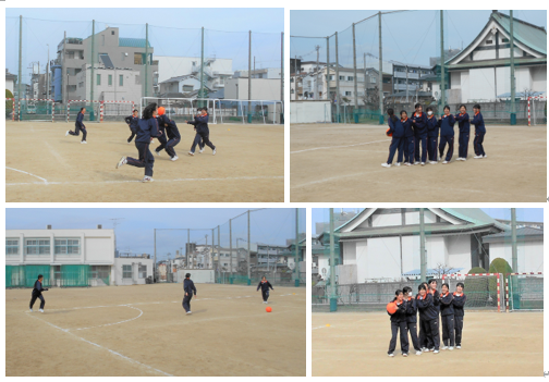 2年生女子の体育は、キックベースボールを行っていますが、普通のキックベースボールとはちょっと違います。守備側は、ボールをキャッチした人の後ろに集まって肩に手を置き列を作ります。この列が完成するまでに、ボールを蹴った選手が一塁を駆け抜けると1点が与えられます。守備側の間をボールが抜けていくと大量失点につながります。どちらの試合も接戦が繰り広げられていました。