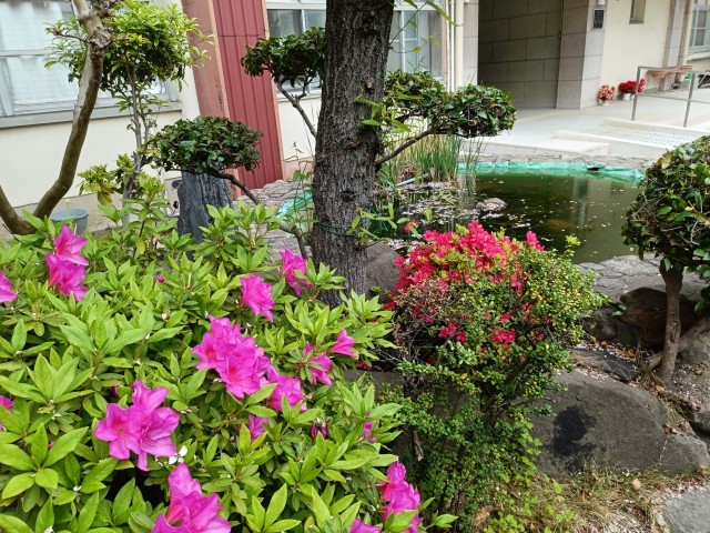 桜の花に青葉が目立つようになってきました。玄関の池のほとりには、つつじの花が満開をむかえています。