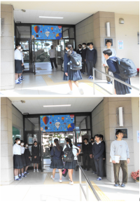 1年生の授業の様子(社会・国語・数学)と3年生女子体育(短距離走計測)の様子です。