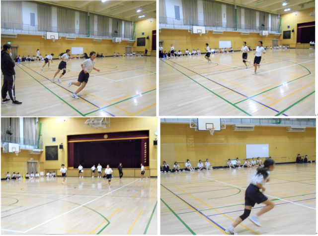 1時間目、グランドでは1年生女子がハンドボール投げ、3年生男子が50m走を、体育館では1年生男子と3年生女子がシャトルランを測っていました。