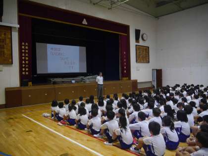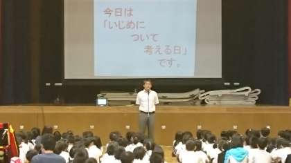 集会では、藤澤校長より今日が3年前から設定された「いじめについて考える日」であることが子どもたちに伝えられ、その後、いじめを取り上げた新聞記事等を題材にプロジェクターを使い、わかりやすく話がありました。