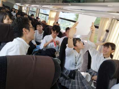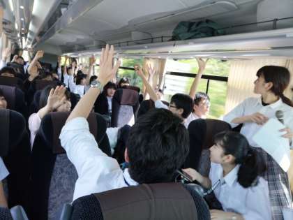 『長崎市内フィールドワーク』を終え、次の『民泊』の集合場所になる公民館に移動中です。バスの中ではレクリエーションが行われています。