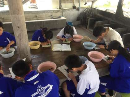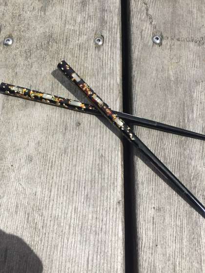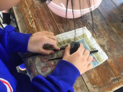 塗り箸作りがスタートしました。隠れている貝殻が見えるように漆を削ります。