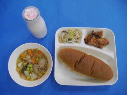 【写真左は、中学校給食のポークチャップ、オムレツ、マカロニスープ他、写真右は、小学校給食の鶏肉のチリソース焼き、中華煮、甘酢あえ他です。】