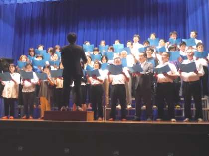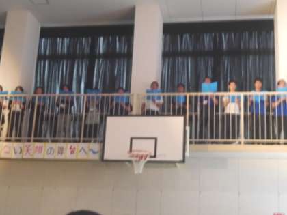 一方、PTAコーラスも参加者が多すぎて、舞台のひな壇に立ちきれない「むくのき合唱団」が構成され、体育館ギャラリーからも声をとどろかす大人の美声?で、児童生徒の手本となる「混声3部合唱」を優雅にハモリました。