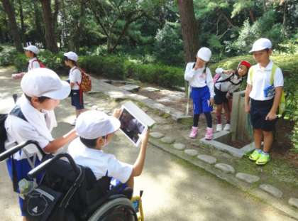 10月10日(金)、3年生は万博記念公園へ校外学習に行きました。公園内ではグループに分かれて、観察の森を中心にオリエンテーリングをしました。各自が園内マップを持って、14ヶ所のポイントをまわり、班のみんなで協力して、iPadで写真を撮っていきました。ポイントの一つに「むくのき」があり、青々と茂った葉を観察しました。