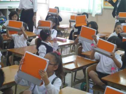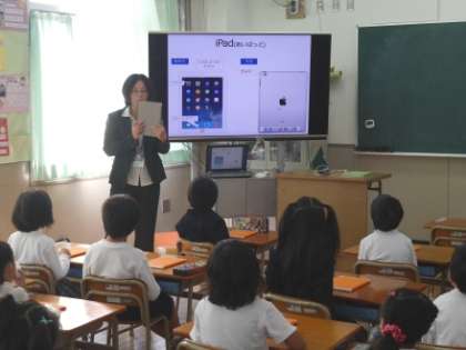 『むくのき学園』では、3年生以上に一人一台のiPadを使えるように整備されていますが、学園内では1・2年生でも、今日のように他学年のiPadを借りて、さらに早い段階から、操作に慣れ親しむ授業実践も行っています。