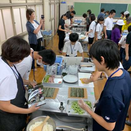 お昼には調理活動があり、キンパやネングを班で役割分担をして、協力しながら作りました。