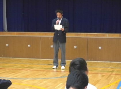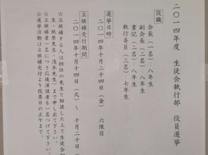 10月14日(火)、未明の台風接近により天候が心配されましたが、ようやく風も収まり、雲の合間から陽光が差し込んできています。今朝の生徒集会では、大阪市立中学校総合文化祭・展示発表の部で表彰を受けた生徒の賞状伝達後、10月24日(金)に行われる「生徒会選挙」に向けて、告示がありました。