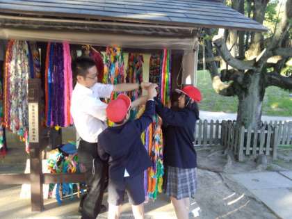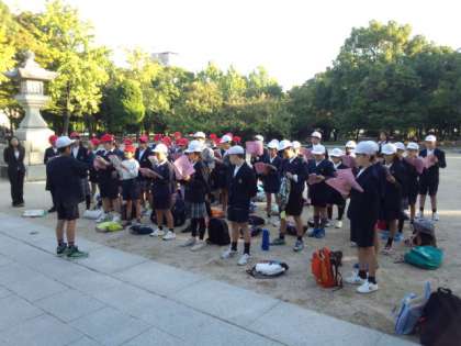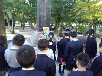 広島での平和学習の最後は、『むくのき学園』の児童生徒の皆さんに協力して折ってもらった 「千羽鶴・亀」 をささげて、平和への祈りを行うセレモニー。原爆供養塔の前では、黙祷をした後、「地球星歌 〜笑顔のために〜 」 の合唱。韓国人原爆犠牲者慰霊碑の前でも同様に、平和への祈りを行いました。このように、「アオギリのうた」の結びにある 「♪広島のねがいはただひとつ せかい中のみんなの明るい笑顔」 が、大切だと感じた半日でした。