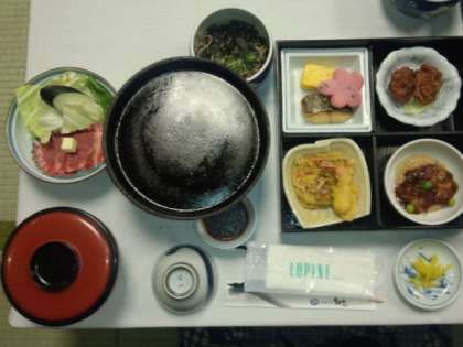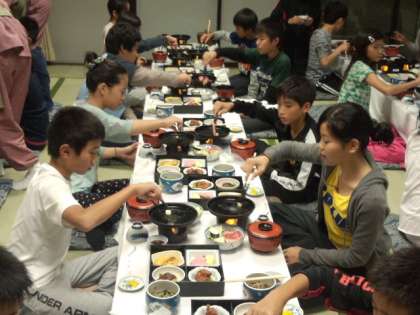 10月15日(水)午後6時45分、最上階の展望大浴場で入浴後、お肉と野菜の鉄板焼・鳥唐揚げ・てんぷら・焼き魚・だし巻き・豆腐バーグ・おそばなど、ボリュームのある夕食をいただきました。食べ切れない児童もいましたが、みんなでワイワイがやがやと食べる夕食は、とても楽しそうでした。