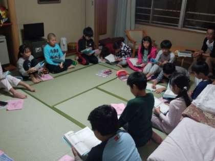 夕食後は、各班が部屋に集まり、お二人の方から聞かせていただいた「聞き取り学習の交流」をしました。それぞれの児童が、たくさんメモを取っていて、全員が発表することで、お互いに学習したことの厚みが増しました。