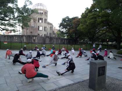 10月16日(木)午前6時、起床の時間前から洗面や身じたくを整える児童も、多く見受けられました。朝の会は、宿近くの平和記念公園内で、体操などを行いました。広島の朝は、気温が11度と冷え込んでいます。天気予報によれば、日中は22度。秋晴れのもと、過ごしやすい一日となりそうです。