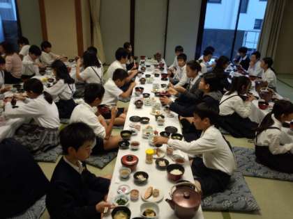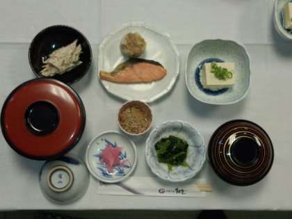朝食は午前7時から。メニューは、さけ・シューマイ・冷や奴・ほうれん草・ごほうサラダ・大根おろし・みそ汁でした。この後、お世話になった宿で閉舎式を行い、「命、平和・・・」たくさんのことを学ばせていただいた地を、後にしました。