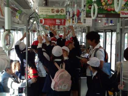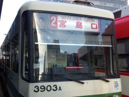 10月16日(木)午前8時15分、宿近くの原爆ドーム前駅から、広島電鉄の路面電車に乗り、風情を楽しみながら宮島口へと向かいました。45分の道中では、途中から風光明媚な海岸線を進み、カキの養殖場を眺めるなど、ゆったりとした電車の旅を味わいました。
