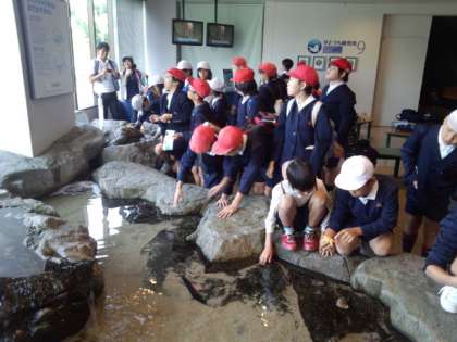 児童たちは、iPadを手にし、いたるところで撮影をしたり、「ふれあいの磯」では、ヒトデやナマコ、ウニなどを手にしたりしていました。多い班では、生き物やグループ写真など、数百枚の撮影をしている班もあったようです。