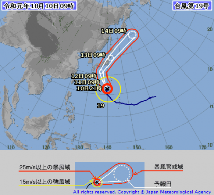 10月10日現在、台風19号(ハギビス)が接近しております。(図は気象庁HPより)