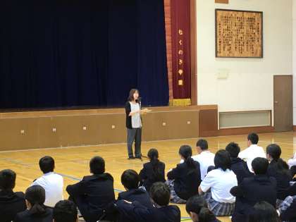 続いて、養護教諭の河村先生より、『あいさつ』はコミュニケーションのはじまりであり、大切であること、『あいさつ』の意味や『あいさつ』にまつわる名言などのお話がありました。