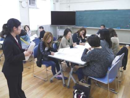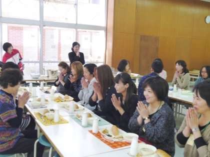視聴覚室で、魚の部位ごとに含まれる栄養素の学習をし、多くの豆知識を学んでいただいた後、児童たちよりも先に給食を試食しました。今日の献立は、「白菜のクリーム煮、揚げ餃子、三度豆の中華和え、ライ麦パン、牛乳」でした。食べ終わる頃が、児童たちがランチルームに来ての給食タイム。参加者には、係分担しての配膳や、おいしくいただいている様子も見ていただきました。