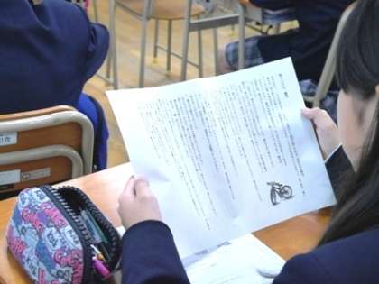 また、9年生では、人間の弱さや醜さを克服する強さ、「誠実な心」を引き出して気高く生きようとする題材の授業でした。心の葛藤を汲み取り、主人公の心情を理解しながら意見発表する態度に、生徒たちの心の成長を感じました。