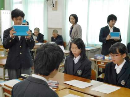 8年生では、7月に体験希望職種調査、9月に iPad にインストールされた「適職 Labo 」を用いて、適職診断や職業調べを実施してきました。今日の「面接練習」では、互いに面接官や受験者の役割を交代しながら、動画を iPad で撮影していました。放課後には、各事業所を訪ねる代表者が、早速、今日の講習を活かしながら、来週の事前訪問日を電話でアポイントメントを取っていました。