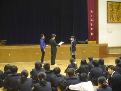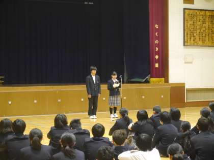 代表校の発表で、どの学校もいじめをなくすために生徒会が中心となって様々な取り組みを行っていること、大阪市全体のスローガンが「いじめ STOP 見逃し 0(ゼロ)」に決まったことが伝えられました。