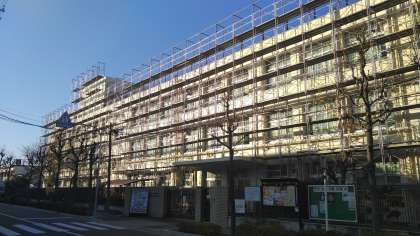 4号館外壁及び屋上防水工事については防塵防音シートも撤去され、足場の撤去と往生防水工事を残すのみとなりました。