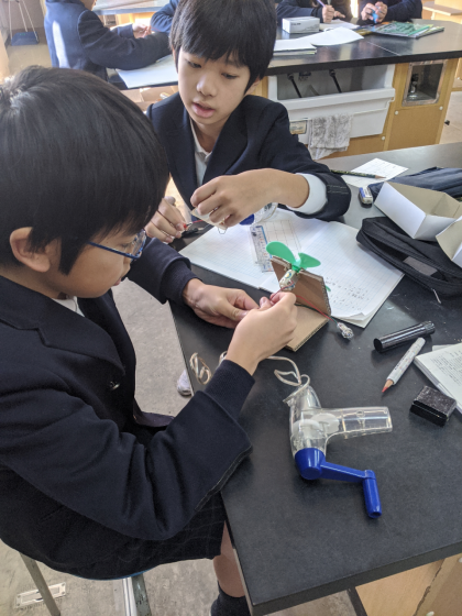 今日は、手回し発電機を使って、電気をつくる実験をしました。